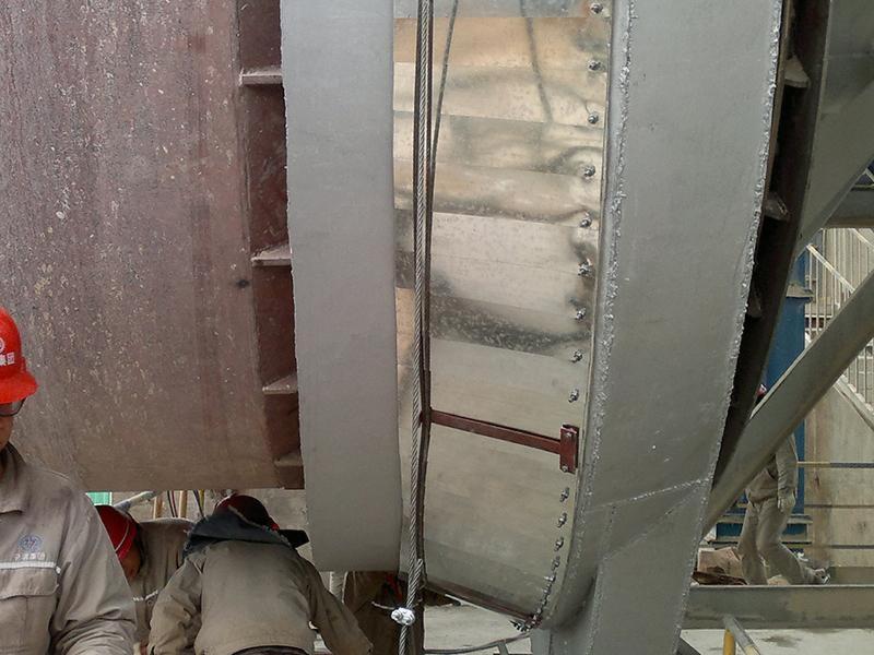 宫静法兰基本贴合,(具体尺寸必须现场勘察及测量及调整冷风套通心度)从而形成两道迷宫。密封罩外端立法兰焊接锥体法兰安装固定耐热钢鱼鳞板。气旋密封工作原理:通过鼓风机从进风口进风后,从出风口吹入冷风套与筒体之间,起到冷却冷风套的作用。气流返回后顺着喇叭口吹向密封罩顶